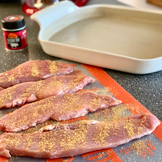 Schnitzel in den flachen Bäker legen und mit Gewürzmischung würzen.